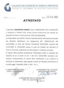 25.06.2003: “Attestato di sussistenza dei requisiti per la progettazione ai fini antincendio”– rilasciato dal Collegio dei Geometri di Torino.