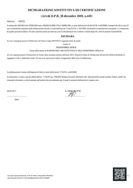 - Iscrizione al Collegio dei Geometri di Torino e Provincia al n. 7754, dal 20.03.2000.